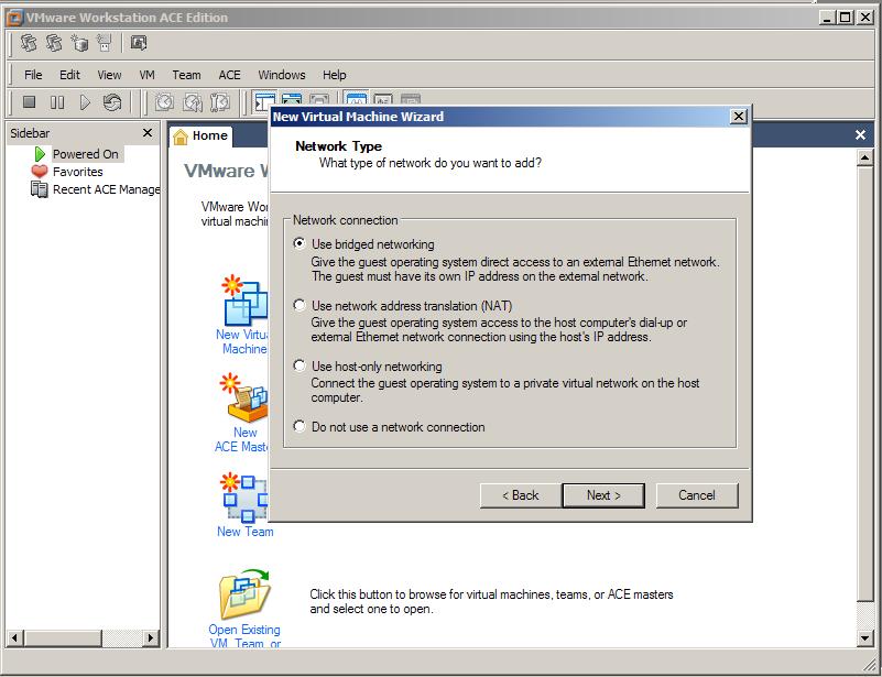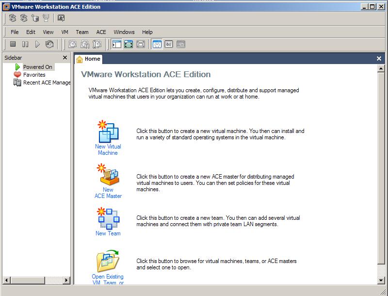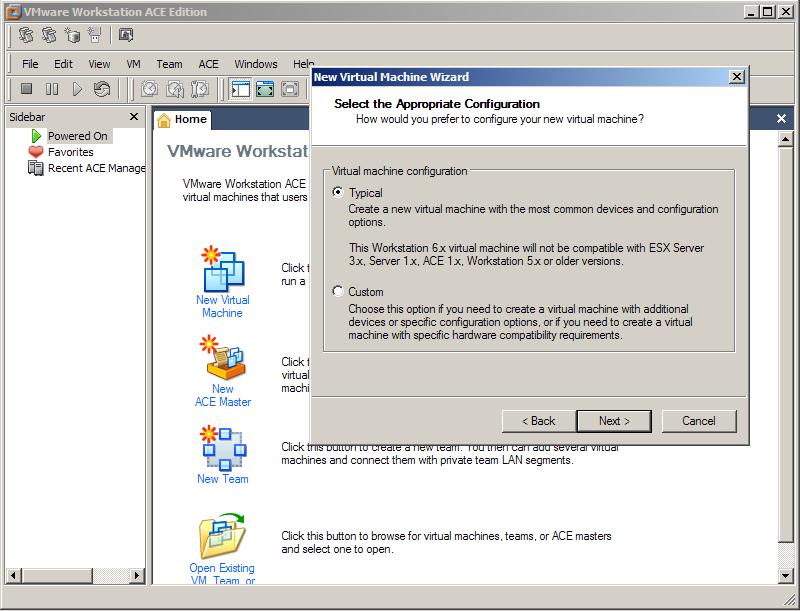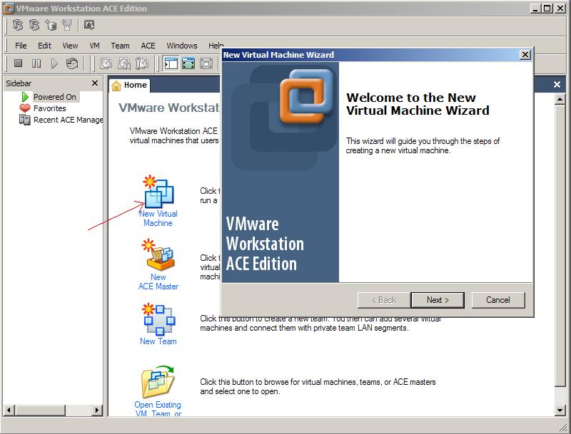เช่น ต้องการทดลองติดตั้ง OS Linux บนเครื่อง Windows XP เป็นต้น เมื่อติดตั้งโปรแกรม VMware แล้วจะสามารถเปิดหลายๆ OS ได้โดยที่ไม่ต้องมีการ restart เครื่องเลยครับ โปรแกรม VMware ที่จะสอนการใช้นี้จะเป็น เวอร์ชั่น VMware Workstation ACE Edition version 6.0.4 เริ่มเลยนะครับ ก่อนอื่นหาโปรแกรมมาติดตั้งที่เครื่องก่อน หลังจากติดตั้งเสร็จ เปิดโปรแกรมมาจะได้ตามรูปด้านล่าง จากรูปด้านบน ให้เลือก New Virtual Machine ตามรูปด้านล่าง หลังจากนั้นให้กด Next