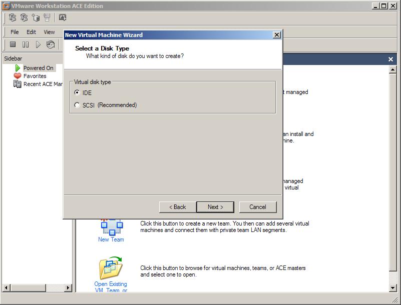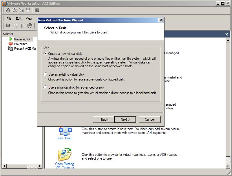 ขั้นต่อไปเป็นการเลือก Disk ให้เลือกข้อแรกครับ Create a new virtual disk เนื่องจากว่ายังไม่เคยติดตั้ง VMware เลย แต่ถ้าเคยติดตั้งแล้ว หรือไป load VMware ที่เคยติดตั้งเสร็จแล้วมา ก็สามารถเลือก Use an existing virtual disk ได้ครับ ส่วนอันสุดท้ายเป็นการเลือก Disk จริงเลยครับ แต่แนะนำให้เลือกข้อแรกดีกว่าครับ สะดวกดี เผื่อผิดพลาดก็ลบทิ้งได้เลยครับ