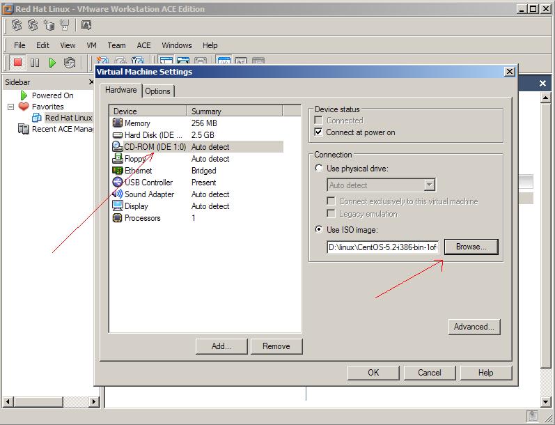ขั้นตอนนี้สำหรับคนที่มี file ISO อยู่ในเครื่อง ให้คลิกที่ CD-ROM แล้วเลือก Use ISO image : แล้ว Browse ไปยังที่ที่มี file ISO อยู่ครับ สำหรับคนที่ใช้แผ่น setup OS จริง ก็เลือก Use physical drive : ครับ