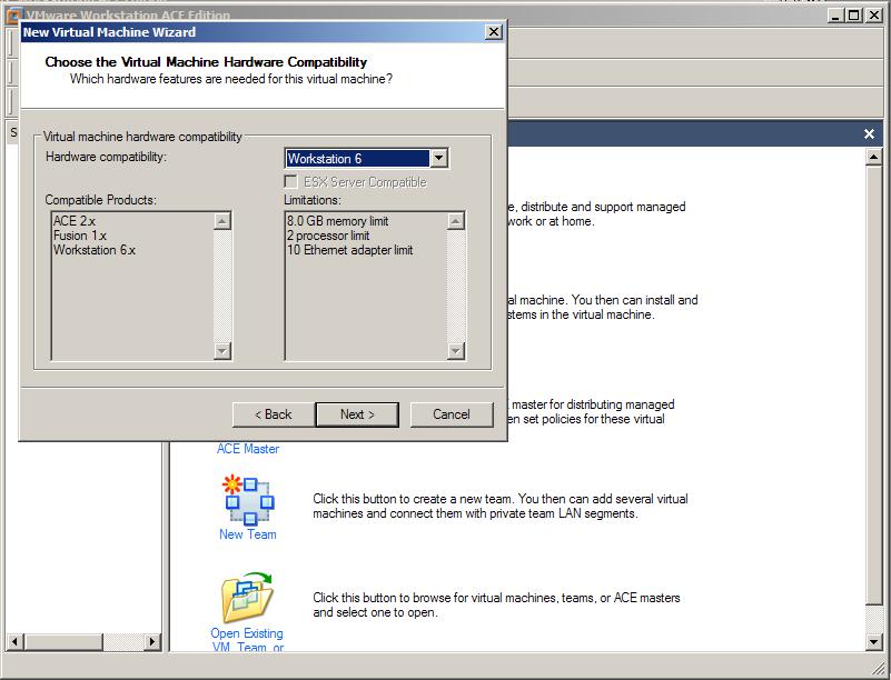 จะปรากฎ Virtual machine configuration ตามรูปด้านล่าง จะมีให้เลือก 2 ประเภทคือ Typical และ Custom เพื่อความเป็นมืออาชีพให้เลือก Custom ครับ เพราะเราจะสามารถกำหนดค่าต่างๆได้เอง แล้วกด Next ขั้นตอนต่อไป เป็นการเลือก Hardware Compatibility ก็เลือกเป็น Workstation 6 ครับ กด Next ต่อเลยครับ