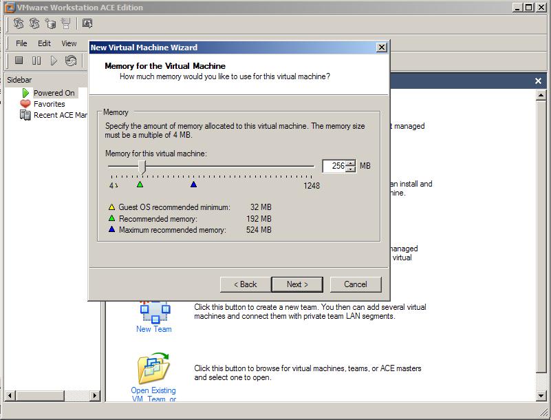 ขั้นต่อไปเป็นการกำหนด Memory ตรงส่วนนี้ ควรจะดู Memory ของเครื่องว่าปัจจุบันเหลือ Memory อยู่เท่าไหร่ เพราะเป็นการแบ่ง Memory มาให้เครื่อง VMware ดังตัวอย่างข้างล่าง แบ่งให้ VMware 256 MB